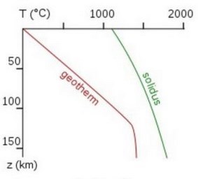 The depth-temperature graph (Figure 6.7) illustrates the relationship between the geothermal gradient (geotherm, red line) and the start of rock melting (solidus, green line). The geothermal gradient changes with depth (which has a direct relationship to pressure) through the crust into upper mantle. The area to the left of the green line includes solid components; to the right is where liquid components start to form. The increasing temperature with depth makes the depth of about 125 kilometers (78 miles) where the natural geothermal gradient is closest to the solidus.