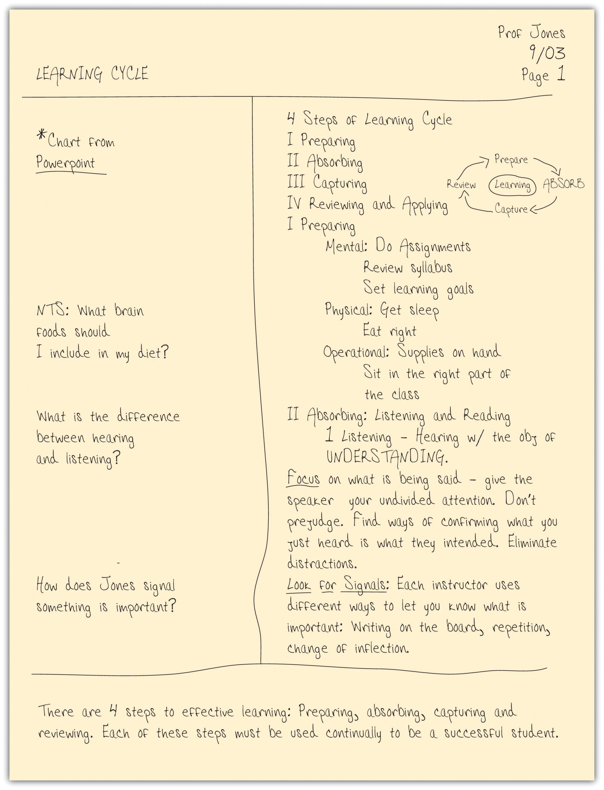 There are various forms of taking notes, and which one you choose depends on both your personal style and the professor’s approach to the material. Each can be used in a notebook, index cards, or in a digital form on your laptop. No specific type is good for all students and all situations, so we recommend that you develop your own style, but you should also be ready to modify it to fit the needs of a specific class or professor. To be effective, all of these methods require you to listen actively and to think; merely jotting down words the professor is saying will be of little use to you.
