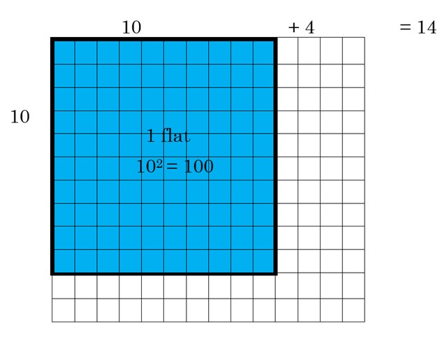 We can fit in two 10 by 10 flats. The rods will line up next to the flats, because rods are 10 long by 1 across. Before you continue reading, see if you can see how many rods you will need, both to the right of the flats and under the flats. Then see if you can tell how many units will be left.